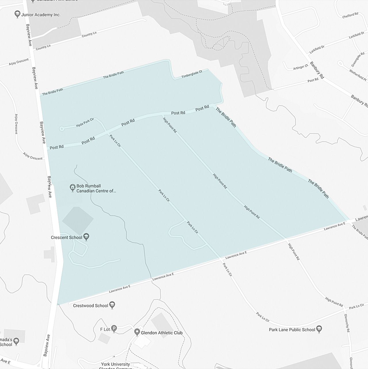 Today, Bridle Path is a quiet, secluded neighbourhood surrounded by the Don River Valley and lush parklands. While the paths have since been paved over, their legacy remains in Bridle Path's wide streets and the name of this elite community.
