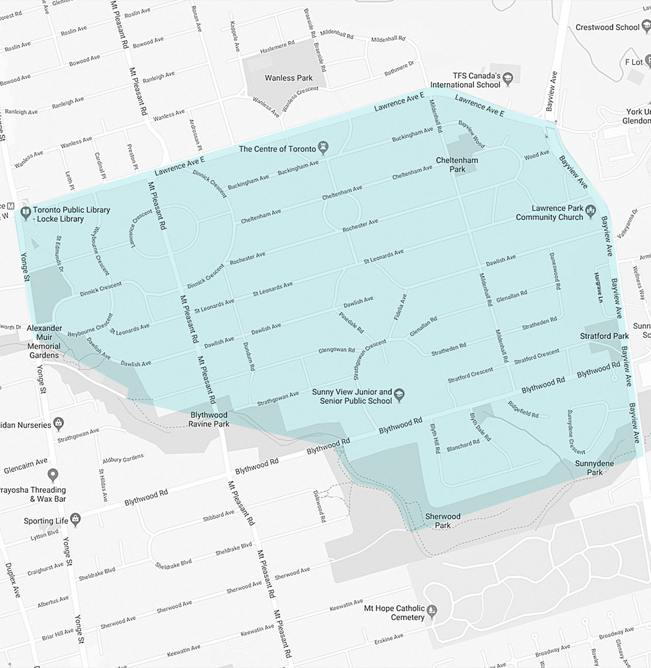 Toronto’s first planned garden suburb, Lawrence Park has become one of Toronto's most exclusive residential neighbourhoods. Located in a tranquil setting with gently rolling hills, winding roads, and lush topography, Lawrence Park is bordered by Yonge Street and Bayview Avenue, and goes from Blythwood Ravine to Lawrence Avenue.